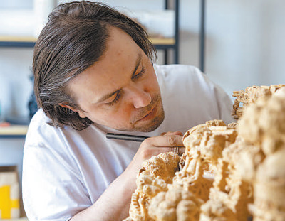 吉扬·布伊素正在雕刻作品。李磊 摄