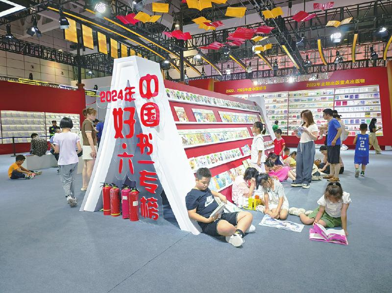 展区正中间,两排矮书架组成了一本展开的书的形状,这里展出的是2024年“中国好书”“六一”专榜入选图书。书架旁边有宽敞的空间,不少孩子和家长席地而坐,认真看起书来。廖女士一边给儿子解答看书时的疑问,一边默默记下书架上的书名,她对记者说:“现在童书很多,我们做家长的其实也苦于不知道怎么挑选好书。这个展区里展出的书都是专家选出来的,是具有权威性的好书,我记下书名,打算一会儿去展场找找买下来。书博会上书又多又全,还有优惠,孩子和我都爱逛!”(记者 隋明照)