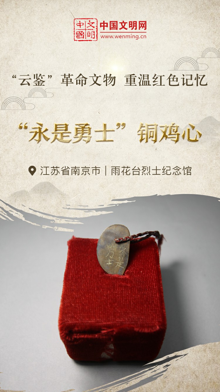 革命文物,承载党和人民英勇奋斗的光荣历史,是弘扬革命传统和革命文化、加强社会主义精神文明建设、激发爱国热情、振奋民族精神的生动教材。中国文明网“文明之声·云鉴馆藏”专栏邀您走进各地革命博物馆、纪念馆、党史馆等红色主题场馆,与广大青少年学生一起“云鉴”红色馆藏,汲取奋进力量。今天为您介绍雨花台烈士纪念馆的馆藏文物——“永是勇士”铜鸡心。