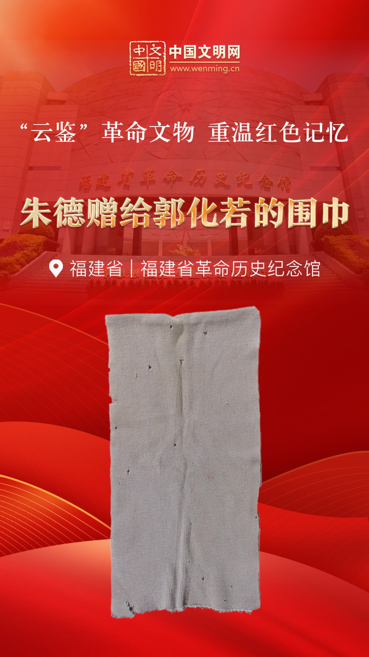 革命文物,承载党和人民英勇奋斗的光荣历史,是弘扬革命传统和革命文化、加强社会主义精神文明建设、激发爱国热情、振奋民族精神的生动教材。中国文明网“文明之声·云鉴馆藏”专栏邀您走进各地革命博物馆、纪念馆、党史馆等红色主题场馆,与广大青少年学生一起“云鉴”红色馆藏,汲取奋进力量。今天为您介绍福建省革命历史纪念馆的馆藏文物——朱德赠给郭化若的围巾。
