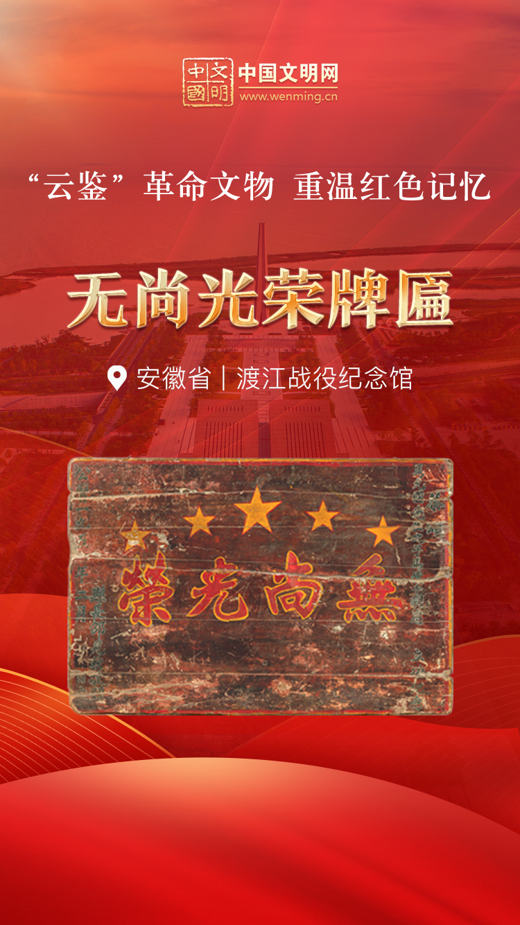 革命文物,承载党和人民英勇奋斗的光荣历史,是弘扬革命传统和革命文化、加强社会主义精神文明建设、激发爱国热情、振奋民族精神的生动教材。中国文明网“文明之声·云鉴馆藏”专栏邀您走进各地革命博物馆、纪念馆、党史馆等红色主题场馆,与广大青少年学生一起“云鉴”红色馆藏,汲取奋进力量。今天为您介绍渡江战役纪念馆的馆藏文物——无尚光荣牌匾。