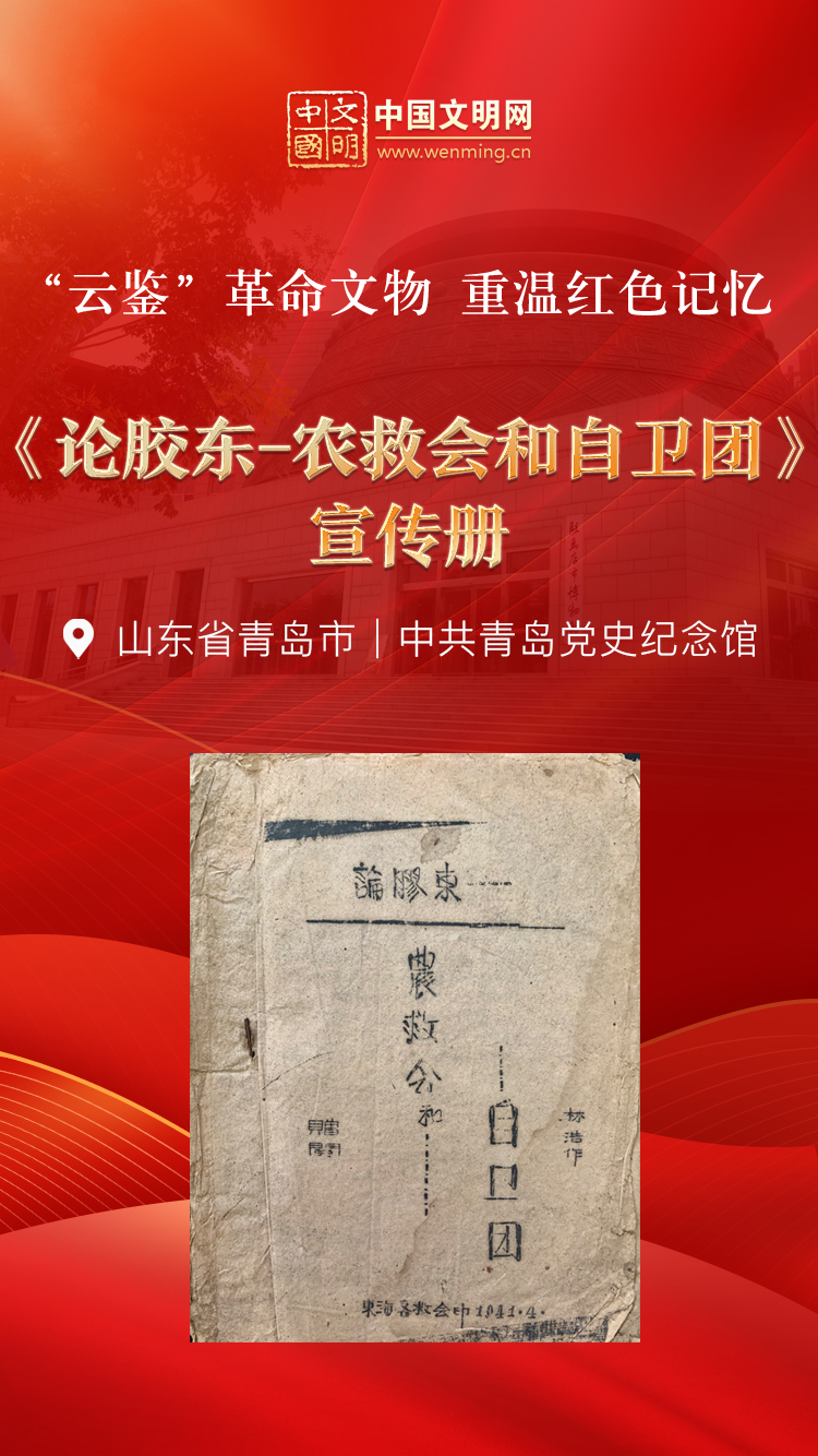 革命文物,承载党和人民英勇奋斗的光荣历史,是弘扬革命传统和革命文化、加强社会主义精神文明建设、激发爱国热情、振奋民族精神的生动教材。中国文明网“文明之声·云鉴馆藏”专栏邀您走进各地革命博物馆、纪念馆、党史馆等红色主题场馆,与广大青少年学生一起“云鉴”红色馆藏,汲取奋进力量。今天为您介绍中共青岛党史纪念馆的馆藏文物——《论胶东——农救会和自卫团》宣传册。