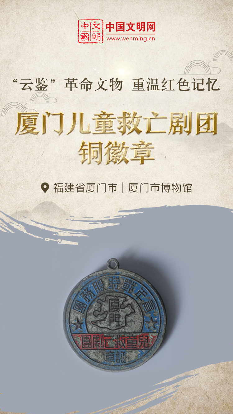 革命文物,承载党和人民英勇奋斗的光荣历史,是弘扬革命传统和革命文化、加强社会主义精神文明建设、激发爱国热情、振奋民族精神的生动教材。中国文明网“文明之声·云鉴馆藏”专栏邀您走进各地革命博物馆、纪念馆、党史馆等红色主题场馆,与广大青少年学生一起“云鉴”红色馆藏,汲取奋进力量。今天为您介绍厦门市博物馆的馆藏文物——厦门儿童救亡剧团铜徽章。