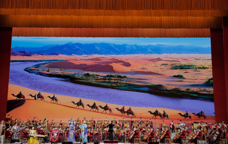 “服装和道具设计上,我们没有选用音乐会常规使用的深色服装,专门对乐队和合唱队的服装进行了全新设计,努力体现中国元素和风格。演奏员的谱架也使用了金色,座椅采用木质红色作靠面,力求整体舞台面貌呈现出既有浓郁的民族风格,又时尚现代的中国气派。背景视频制作上,我们广泛遴选与音乐作品相匹配的背景内容加以设计。以写意手法为主,营造与音乐内容气质、时代背景相契合的舞台情境,增强音乐会视听感受。”沈晨说。