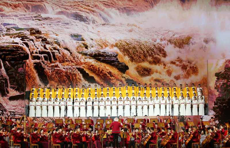 第一乐章中,管弦乐《第一交响序曲》、大合唱《黄河大合唱》气势磅礴,充分展现新民主主义革命时期中国人民浴血奋战、百折不挠,在党的领导下夺取伟大胜利、建立新中国的光辉历程。