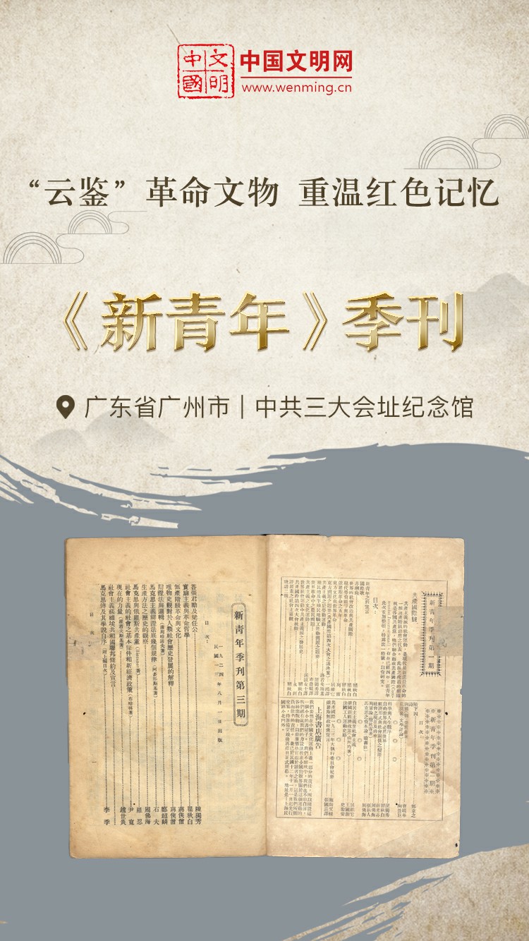 革命文物,承载党和人民英勇奋斗的光荣历史,是弘扬革命传统和革命文化、加强社会主义精神文明建设、激发爱国热情、振奋民族精神的生动教材。中国文明网“文明之声·云鉴馆藏”专栏邀您走进各地革命博物馆、纪念馆、党史馆等红色主题场馆,一起“云鉴”红色馆藏,汲取奋进力量。今天为您介绍中共三大会址纪念馆的馆藏文物——《新青年》季刊(第叁期)。