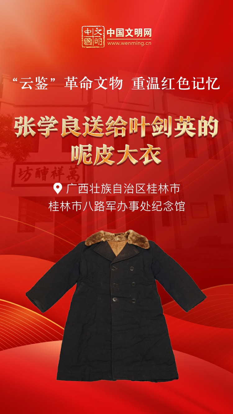 革命文物,承载党和人民英勇奋斗的光荣历史,是弘扬革命传统和革命文化、加强社会主义精神文明建设、激发爱国热情、振奋民族精神的生动教材。中国文明网“文明之声·云鉴馆藏”专栏邀您走进各地革命博物馆、纪念馆、党史馆等红色主题场馆,一起“云鉴”红色馆藏,汲取奋进力量。今天为您介绍桂林市八路军办事处纪念馆的馆藏文物——1936年张学良送给叶剑英的呢皮大衣。