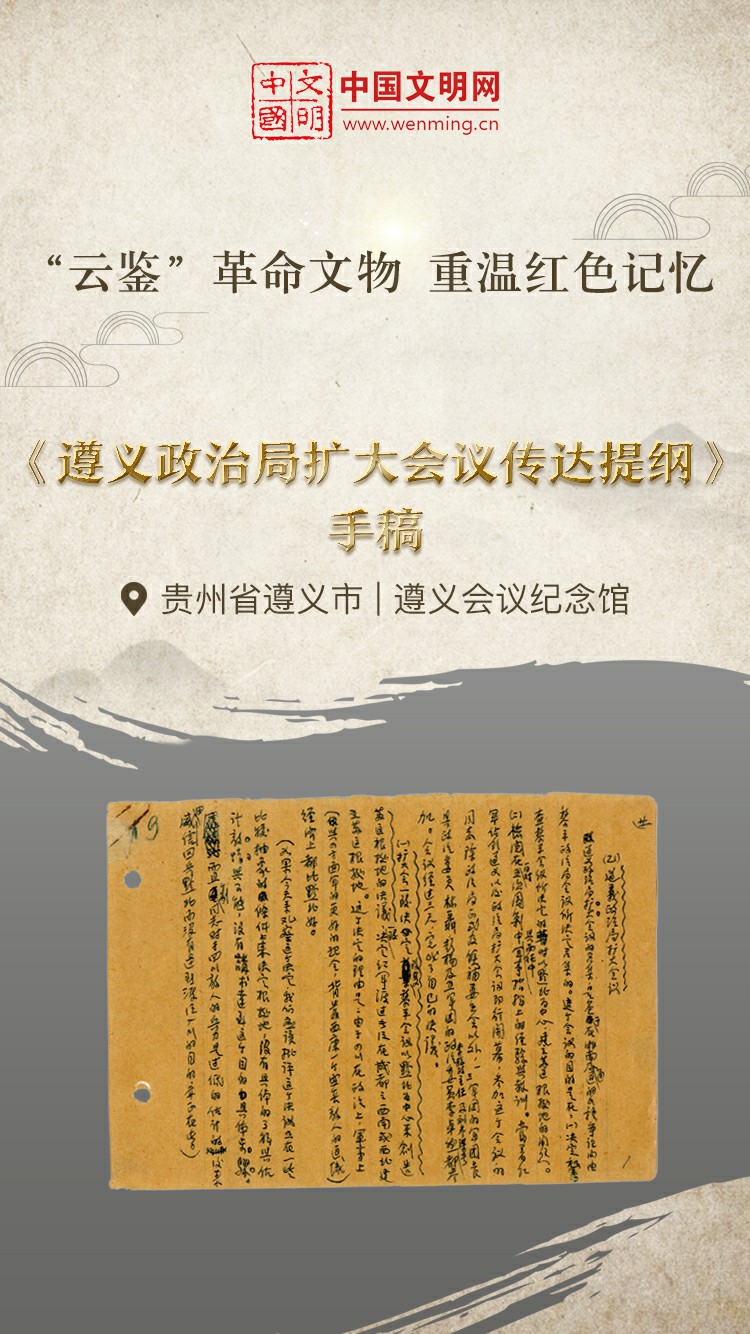 革命文物,承载党和人民英勇奋斗的光荣历史,是弘扬革命传统和革命文化、加强社会主义精神文明建设、激发爱国热情、振奋民族精神的生动教材。中国文明网“文明之声·云鉴馆藏”专栏邀您走进各地革命博物馆、纪念馆、党史馆等红色主题场馆,一起“打卡”红色地标,“云鉴”红色馆藏,汲取奋进力量。为纪念遵义会议召开90周年,今天为您介绍遵义会议纪念馆的馆藏文物——《遵义政治局扩大会议传达提纲》手稿。