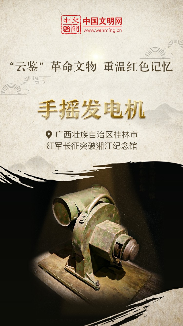革命文物,承载党和人民英勇奋斗的光荣历史,是弘扬革命传统和革命文化、加强社会主义精神文明建设、激发爱国热情、振奋民族精神的生动教材。中国文明网“文明之声·云鉴馆藏”专栏邀您走进各地革命博物馆、纪念馆、党史馆等红色主题场馆,一起“打卡”红色地标,“云鉴”红色馆藏,汲取奋进力量。今天为您介绍红军长征突破湘江纪念馆的馆藏文物——手摇发电机。