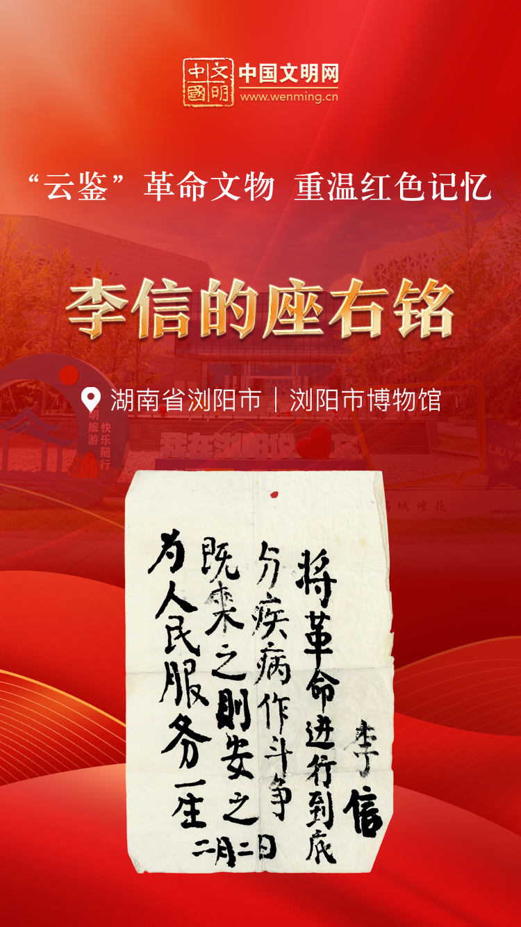 革命文物,承载党和人民英勇奋斗的光荣历史,是弘扬革命传统和革命文化、加强社会主义精神文明建设、激发爱国热情、振奋民族精神的生动教材。中国文明网“文明之声·云鉴馆藏”专栏邀您走进各地革命博物馆、纪念馆、党史馆等红色主题场馆,一起“打卡”红色地标,“云鉴”红色馆藏,汲取奋进力量。今天为您介绍浏阳市博物馆的馆藏文物——李信的座右铭。